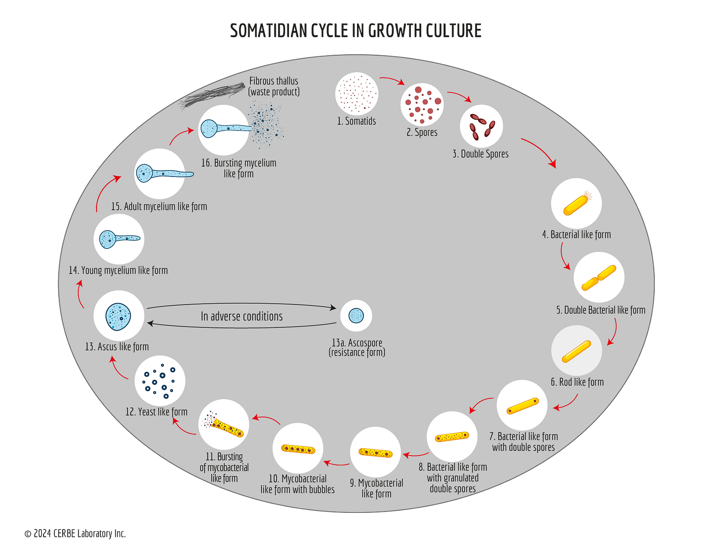 This pleomorphic foundation of life has been documented and refined by successive researchers: Henry Charlton Bastian’s archebiosis experiments revealed early evidence of pleomorphic transformations; Béchamp identified the microzyma as the indestructible unit of life, capable of both creative and degenerative cycles; Enderlein formalized the protit system, distinguishing lawful “normal” cycles of health from pathogenic cycles of disease; Rife optically tracked transitional forms across microbial stages and linked them to tumor development; and Naessens mapped the somatid’s 3-stage micro-cycle in health and its 16-stage macro-cycle in degeneration.