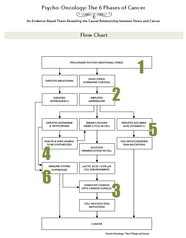 The paper Psycho-Oncology: The 6 Phases of Cancer by Glen Russell integrates the somatid directly into his cancer model, portraying it as the pivot between psycho-emotional stress, metabolic collapse, and malignant transformation. The framework outlines a six-step sequence, each phase deepening the terrain conditions that ultimately activate the somatid’s long pathogenic cycle.